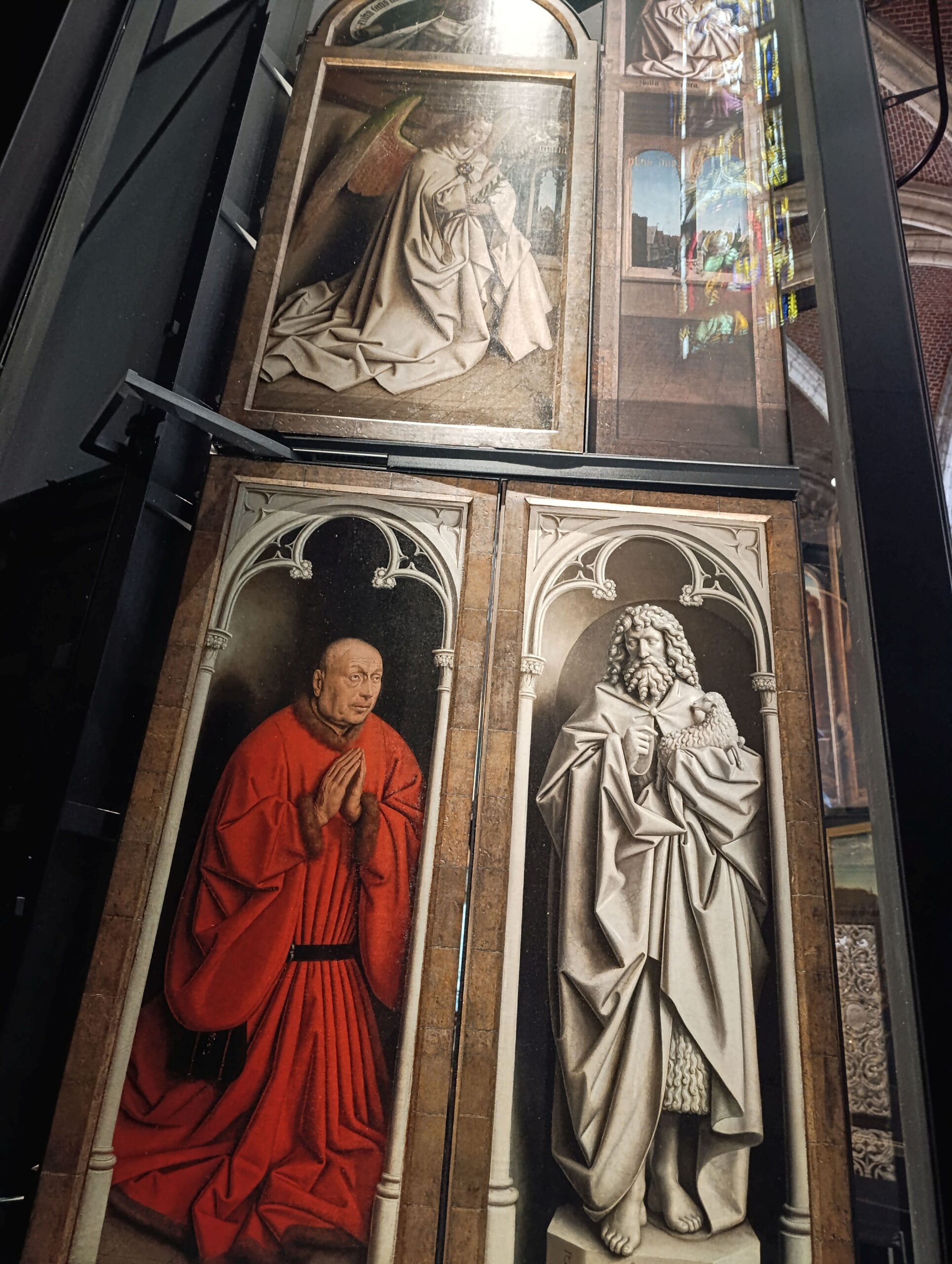 Timp de mai mulți ani, cele două brâuri cu îngeri și cele patru brâuri cu drepți au dispărut din peisaj. Abia în 1821 au devenit cunoscute aventurile lor pe piața de antichități. Vicarul spera să obțină un preț en-gros de numai 600 de franci pentru 6 panouri, chiar și cu o imagine pe fiecare parte. Cu toate acestea, negustorul de vechituri Nieuwenhuys din Bruxelles a plătit de zece ori mai mult, dar cu condiția să îndepărteze imediat «scândurile putrezite». Le Suret ar izbucni de furie dacă ar afla că negustorul de vechituri a revândut imediat «scândurile» cu 100 000 de franci. Este adevărat că Nieuwenhuys își credea cumpărătorul la fel de nebun ca și vicarul. Dar negustorul de lemn Edward Solly nu era nebun. Ca britanic, în timpul războaielor napoleoniene, el reușise să se impună în Europa și, pe sub nasul francezilor, a introdus ilegal în Anglia lemnul necesar flotei. Solly a făcut milioane și le-a investit în mod neașteptat în picturi. Acest negustor-contrabandist de lemn a fost unul dintre primii care au realizat valoarea picturii Renașterii nordice și a făcut mai mulți bani din ea decât din proviziile militare.